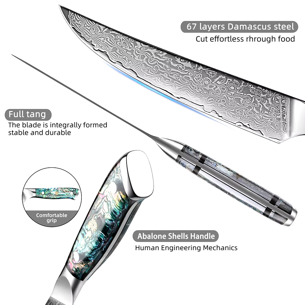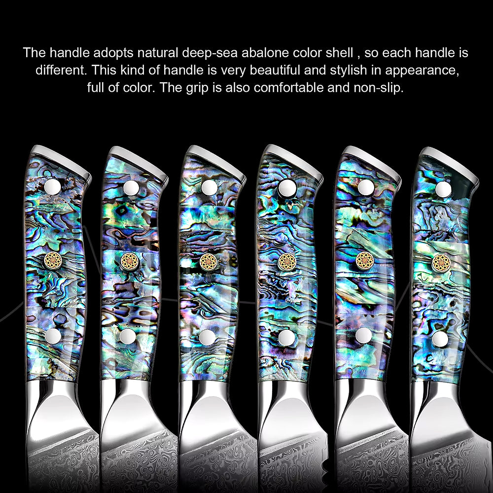 Unique Abalone Shell Handles: The handles are crafted from natural deep-sea abalone shell, ensuring each knife handle has its own unique pattern and colors. These eye-catching handles not only provide an aesthetic appeal but are also ergonomically designed for a comfortable, non-slip grip, ensuring safety during use.
