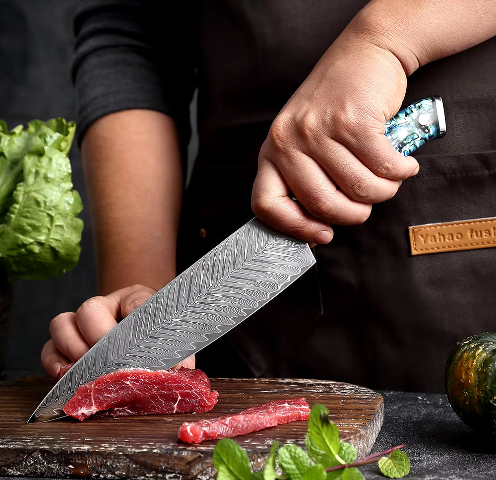 Elegant and Durable: Designed for both professional chefs and home enthusiasts, these knives are as durable as they are beautiful. The combination of Damascus steel and abalone shell creates a piece that’s both practical and artistic, built to last for years to come.