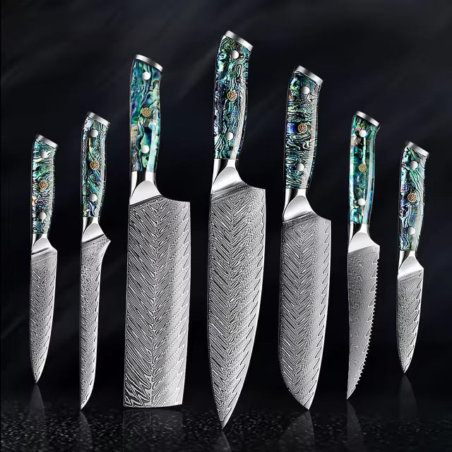 Elevate your culinary experience with our Japanese Damascus Steel Knife Set, featuring stunning abalone shell handles. Crafted with precision and beauty, this set is not just a tool but a statement in the kitchen.