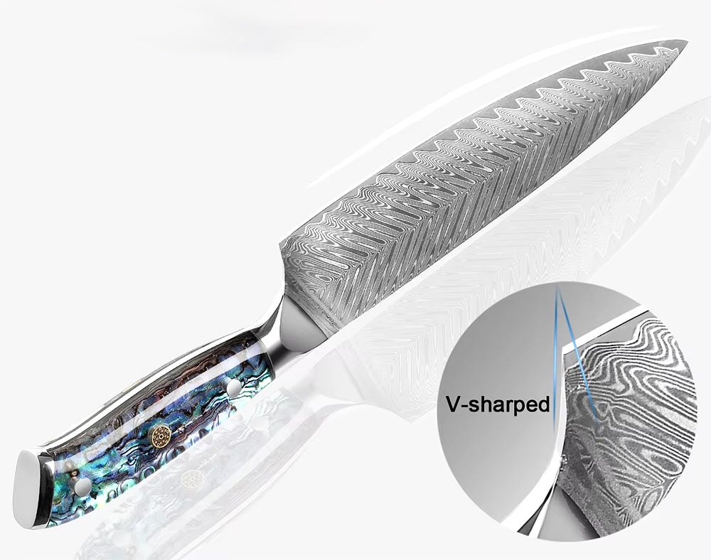 - Beauty and Functionality: The perfect fusion of elegance and high-performance. The unique abalone handles ensure each knife is one-of-a-kind.